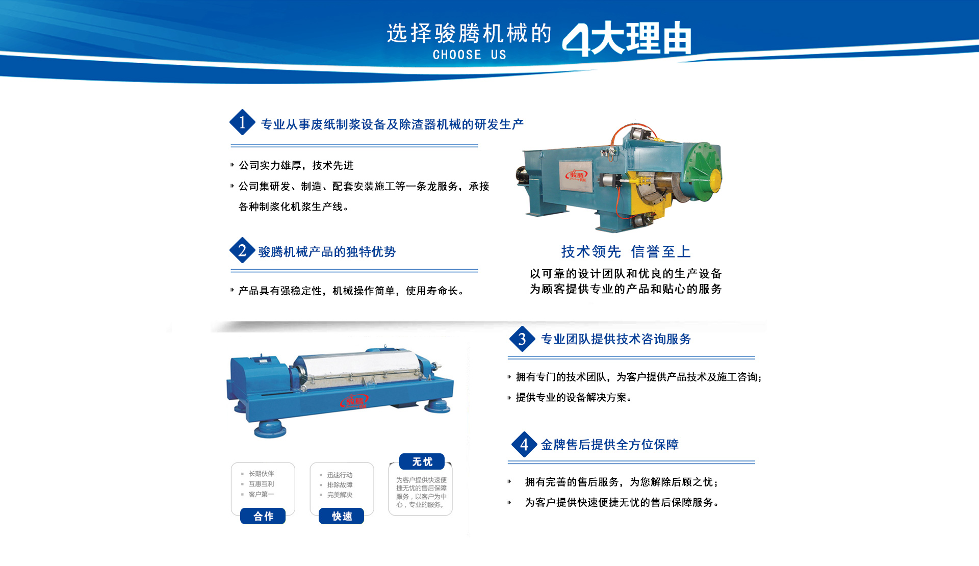 安丘市駿騰機(jī)械制造有限公司位于中國風(fēng)箏之都濰坊南35公里,座落在青云湖畔,是具有活力的安丘市興安街道工業(yè)園。 依托風(fēng)箏之都完善的工業(yè)基礎(chǔ)和發(fā)達(dá)的機(jī)械制造業(yè),公司致力于廢紙制漿設(shè)備及除渣器機(jī)械的研究與制造。 公司始終堅(jiān)持以市場需求為先導(dǎo),客戶利益為目標(biāo),嚴(yán)格執(zhí)行國家技術(shù)及行業(yè)標(biāo)準(zhǔn),保證產(chǎn)品品質(zhì),提供專業(yè)服務(wù),用專業(yè)的產(chǎn)品與真誠的客戶實(shí)現(xiàn)共同發(fā)展,是我們終生奮斗的目標(biāo)。讓我們攜手共進(jìn),創(chuàng)造美好明天。 我們熱情期待著您的光臨指導(dǎo),洽談業(yè)務(wù)! 查看更多>>